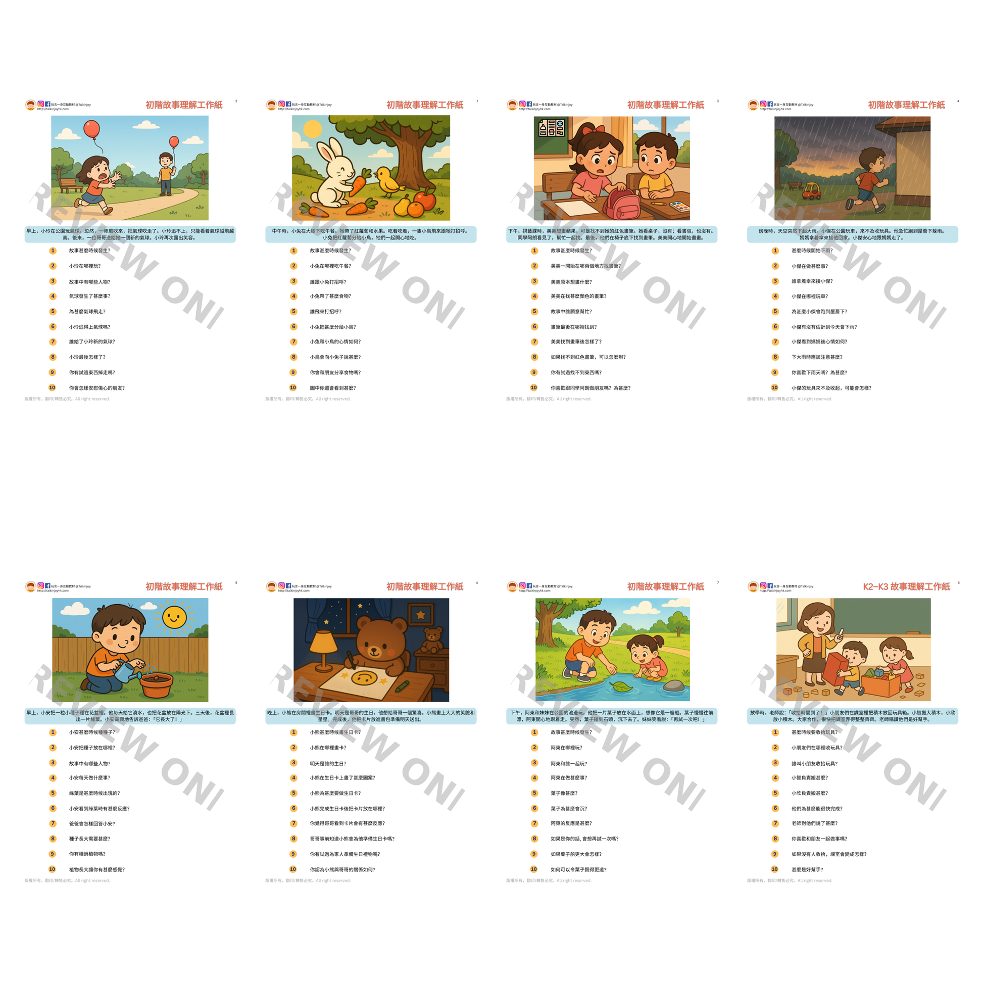 本教材專為幼兒設計,透過生活化故事插圖與引導式問題,幫助孩子建立基礎的閱讀理解能力,培養專注力、語言理解及表達能力,適合在家或課堂使用。