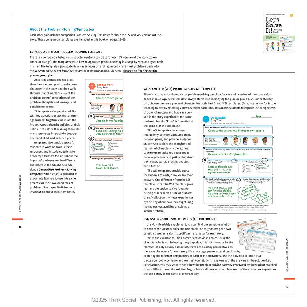 The Teaching Guide includes corresponding Let's Solve It! (LSI) and We Solved It! (WSI) problem-solving templates to help guide discussions and teaching. Complete the LIS problem solving template after reading the LSI version of the story, then complete the WSI problem-solving template after reading the WSI version to discuss how the same social problem was avoided or solved and how various actions and responses impacted different characters' thoughts and feelings.
